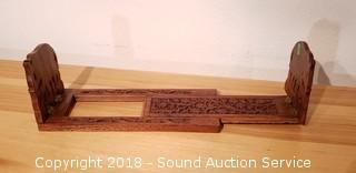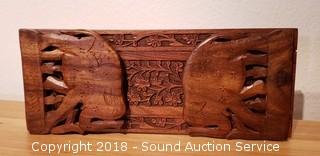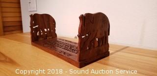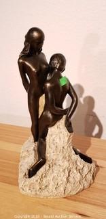 Board is marble, chess pieces are wood. The nude sculptures/bookends are composite, signed "Tuptan", approx. 8.5" to 9.5" H. Wood elephant bookends are one piece, slides to adjust. Board is 13-1/2" square, 3/4" thick.