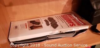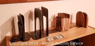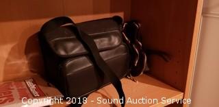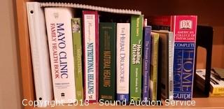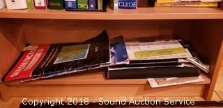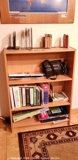 Includes: Road atlases, medical and health books, metal bookends, furniture slider kit, and camera bag. Shelf has 2 adjustable shelves, approx. 42" H, 31-1/2" W, 11" D.