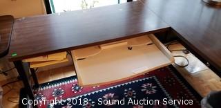 Pull out keyboard tray, drawer, and 2 file drawers. Approx. 29-1/2" H, 60" and 70"L, 30" and 18" D.
