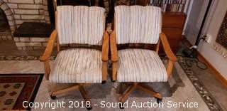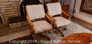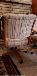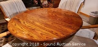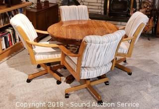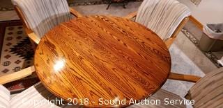 Chairs are padded, rolling, reclining. Table and chairs are all in excellent condition. Table opens up for leaves, no leaves. Approx. 30" H, 41" diameter.