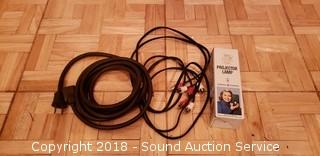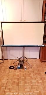 Comes with projector lamp, empty reel, and projection screen. Makes sound when you plug it in, motor has an electrical smell to it, unsure if it works or not.