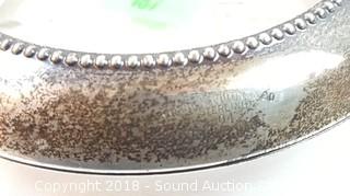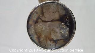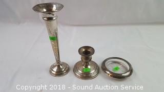 Includes: Silver overlay coaster (marked "Frank Whiting & Co Sterling"), weighted sterling candlestick holder (arrow through a K hallmark), and weighted sterling vase (inscribed "E&E 1903-1928"). Vase is 8" H.