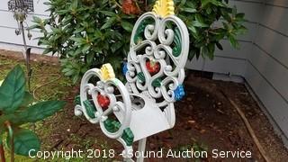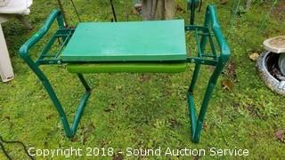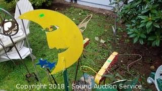 Includes: Kneeler gardening bench, various steel yard stakes, garden hose stake with spout, and statuaries.