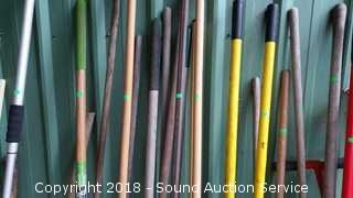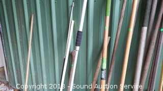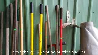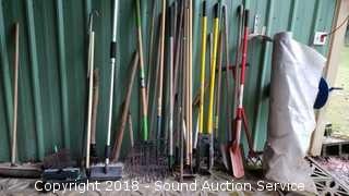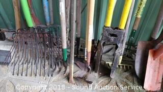 Includes: Hoes, Post Hole Digger, Rakes, Pitchforks, Cultivators, Loppers, Automotive Cleaning Brushes, Digging Bar, Splitting Axe, 4ft x unknown gardening fabric, and more.