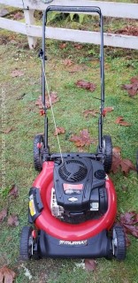 Intek fired right up, is a 3-in-1 convertible power drive mulching mower. Murray sounds like its not getting spark. Wheelbarrow is 8 cu. ft, 2 wheels.