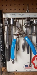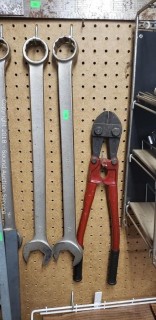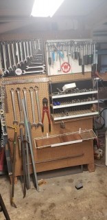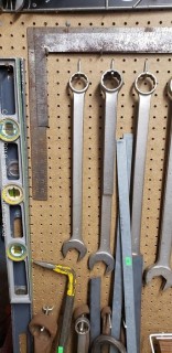 Mostly Wright Tools. Includes: Standard wrenches, 3/8" to 1/2" drive ratchets, 3/8" to 1/2" drive extensions, 3/8" and 1/2" drive standard sockets with organizer, 18" bolt cutters, 2ft and 4ft level, carpenters square, and pry bars.