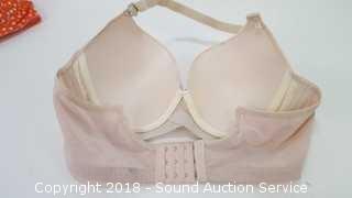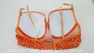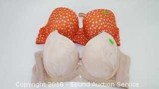 Tan and orange stars. By Chuns. They are size 40?, believe they are a D cup. All have light padding, removable straps, all have underwires. One has one strap set as a halter top style.