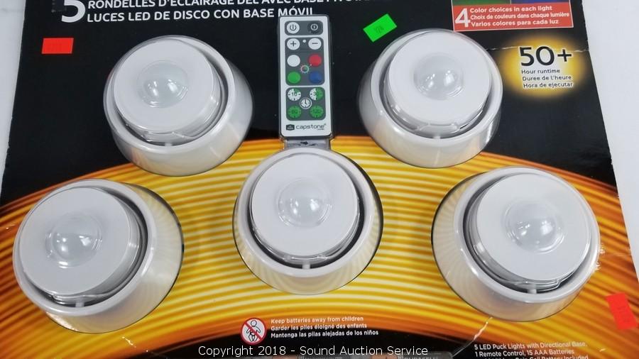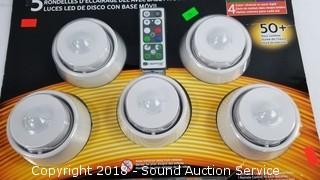 Comes in original packaging. Comes with 5 puck lights, 5 bases, remote control and batteries.