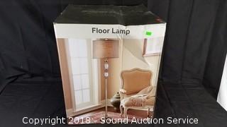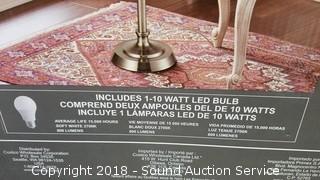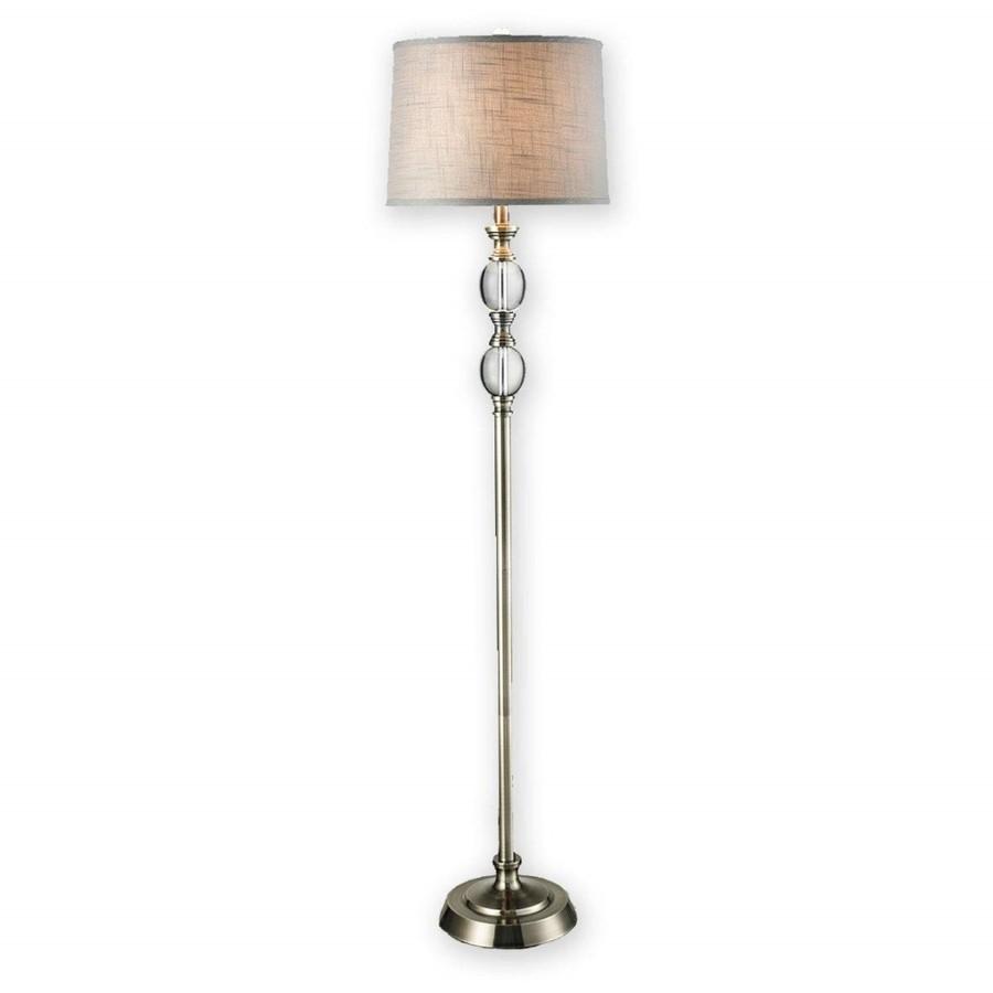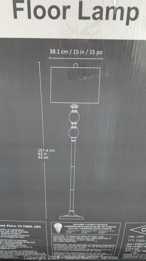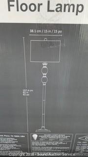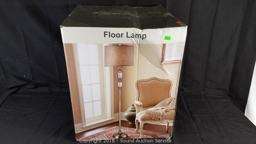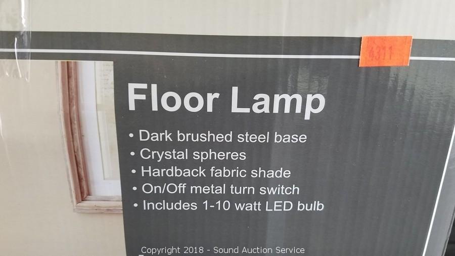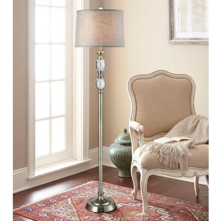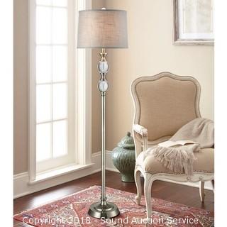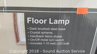 Some assembly required, unassembled in original packaging. Dark brushed Steel, Crystal Spheres & Hardback Fabric Shade. Approx. 62" H x 15" Diameter.