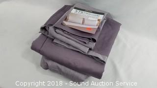575 thread count, 80% cotton, 20% polyester. Lavender color. 1 flat, 1 fitted, 2 pillowcases.