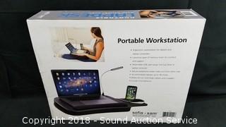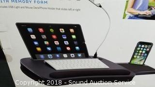 Ergonomic workstation for tablets and laptops, built in LED light, mouse pad/phone holder, media slot for larger tablets and E readers. Comes in original box.
