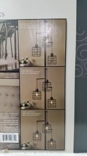 Comes in original packaging, some assembly required. Bronze finish, steel construction, tiered 3 lights with open metal cage shades.