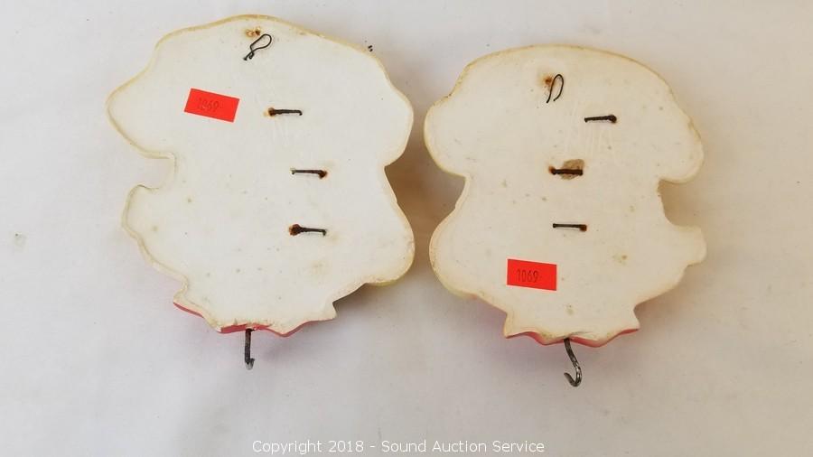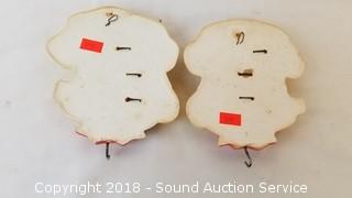 Each one has a hook to hang it on the wall. A couple small chips in the paint. Approx. 6" x 5".