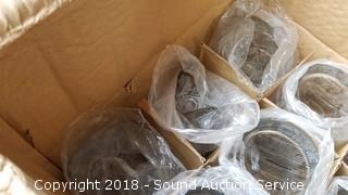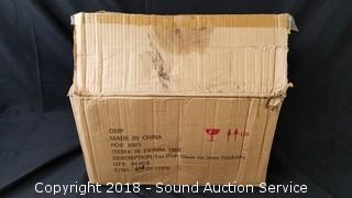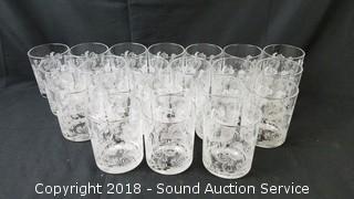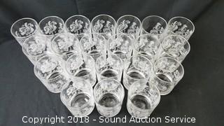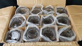 Approx. 3mm thickness, 4-1/2" tall, 3-3/4" diameter. All in original box. Supposed to be 24 pc but 3 are shattered inside the box.