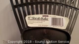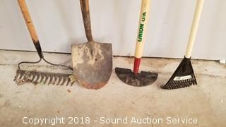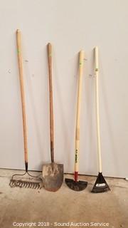 Includes: 8" shrub rake, lawn edger, spade shovel, and steel rake.