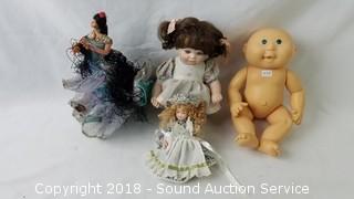 Includes: 1978 Bradley Musical Doll, 1993 Hasbro Cabbage Patch Kid Doll Signed by Artist Xavier (Looks to be Pen Signed), Serranilla Doll, Small Porcelain Doll, 1995 Songs of Innocents Lullaby & Goodnight Porcelain Doll, Cloth Doll & Boston Quartz West Germany Clock.