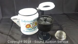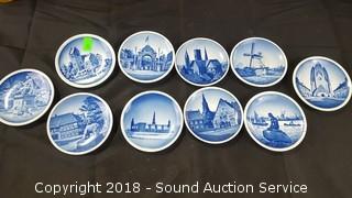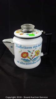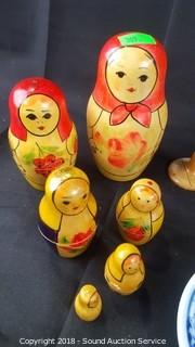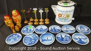 Includes: Berrgren Swedish Enamelware Percolator Coffee Pot, 6pc. Russian Nesting Doll (1" to 4"), (9) 4" Norwegian Glass Stem Vases, and 10 Royal Copenhagen Made in Denmark 3-1/4" Collector Plates.