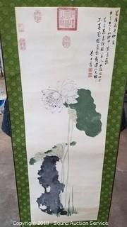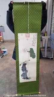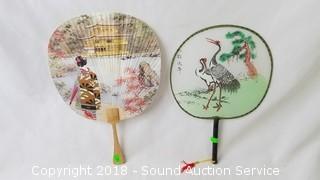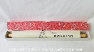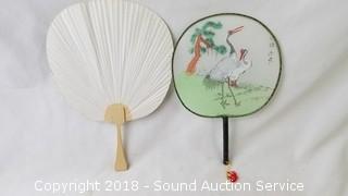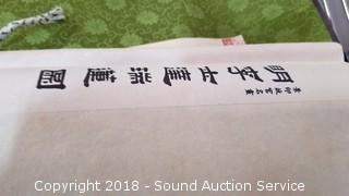 Includes: 6ft x 18.5" Original Scroll Artwork Bordered in Silk (Cannot make out script, comes with original box), Silk Hand Painted A/S Fan, Other Fan, and Hand Crafted Sun Hats (16" diameter).