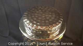 Canister is silver metallic enamel mirrored finish with hammered look, approx. 12" H, 7" diameter. Lantern has original tag.