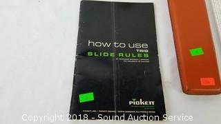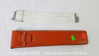 Slide rule is a deci-lon with leather case and instruction manual.