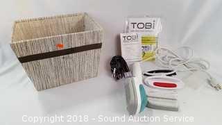 Comes with owners manual, attachments, and basket. Basket is approx. 9" x 12" x 9".