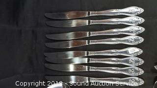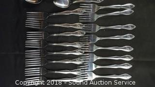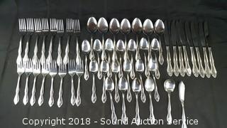 Made in Korea all monogrammed with a "B". (8) Butter Knives, (7) Large Spoons, (17) Small Spoons, (8) Small Forks, (8) Dinner Forks, Spreader Knife & Tea Spoon.