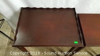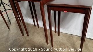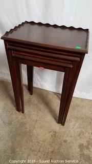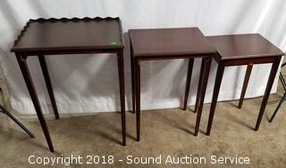 Solid mahogany. Each stack into each other. Tallest one has a pie crest edge. Approx. 16" to 25" H, 13-1/2" to 18" W, 10-1/2" to 13" D.