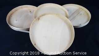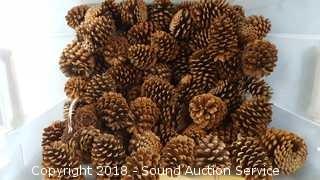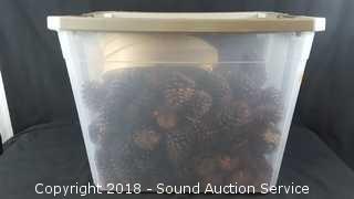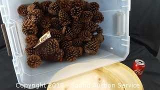 Lot #0152: 27gal Tote w/Wood Trays & Decorative Pine Cones