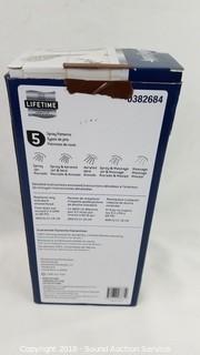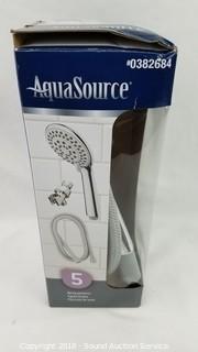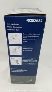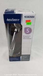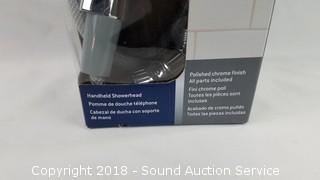 Polished chrome finish, 5 spray patterns. Missing ceiling tape and plastic washers.