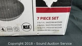 Comes in original box, complete. Has been heavily use, non-stick coating is scratched. Includes: 2QT Sauce Pan w/Lid, 3QT Sauce Pan w/Lid, 7.8QT Stock Pot w/Lid, and 10" Fry Pan. Non-stick internally reinforced with ceramic and titanium.
