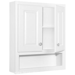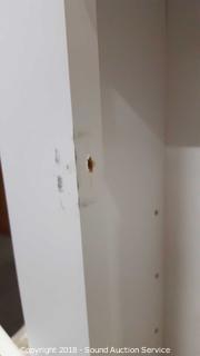 Comes in original box. Approx. 28" H, 23.25" W. Hinges on one door are stripped. White. Decorative hardware included, Fully assembled for easy installation, 2 adjustable shelves.