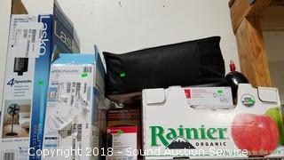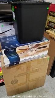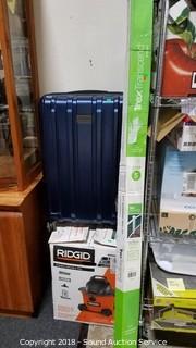 Includes: Hard side suitcase, Ridgid 6 gallon wet dry vac, ceiling fans, pedestal fan, window fan, outdoor lighting, comforter, tile saw, various hardware, bathroom faucet, and much more. **CART NOT INCLUDED**