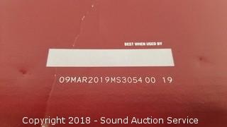 Box has some damage, looks to be sealed. Contains 30 packs of 4. Best by March 9, 2019.