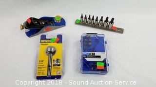 Includes: 23pc. Kobalt Hex & Star Bits, 8pc. Kobalt Hex & Star Bits, 1-1/4" Irwin Forstner Bit, and Kobalt 1-1/2" Plane.