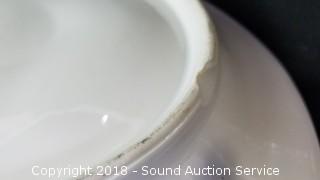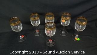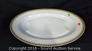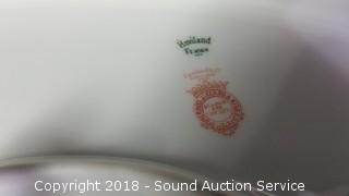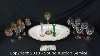 Most the stemware is gold trim, also comes with an ornate painted gold tall goblet. Platter is Haviland Limoges France (has a chip on the base underside), Approx. 20" x 14". Glasses & vases are 6-1/2" to 10" tall.