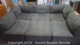 Comes in 6 pieces, can be set up various ways. 3 pieces are 32" W. Corner pieces are 37" W. Ottoman is 33" square. Feet have some minor scuffs and scrapes, minor wear on the underside of a couple sections. Has some stains on the fabric, looks like something was spilled on the back. Minor, see photos.