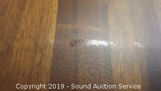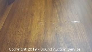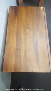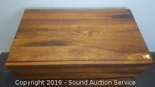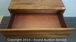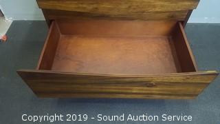 Like new in original box. Comes assembled. A couple small shiny residue spots on the top. 27" H, 31" W, 16" D. Made in Indonesia. Dovetail drawer construction with ball bearing drawer guides.