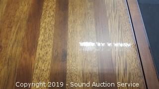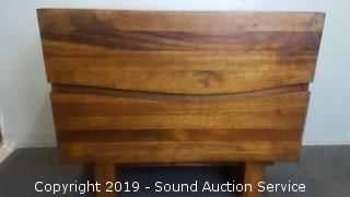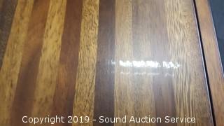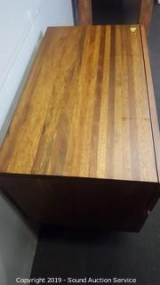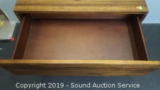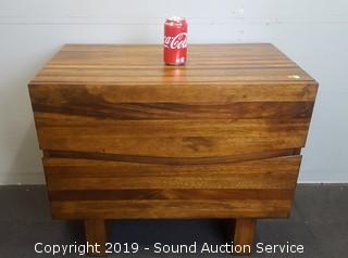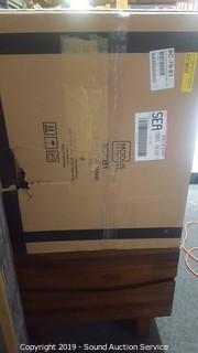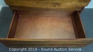 Like new in original box. Comes assembled. A couple small shiny residue spots on the top. 27" H, 31" W, 16" D. Made in Indonesia. Dovetail drawer construction with ball bearing drawer guides.