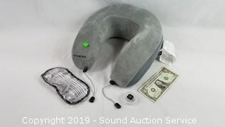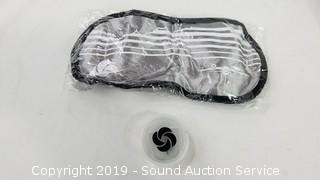 Includes: Neck pillow, eye mask, and ear plugs.
