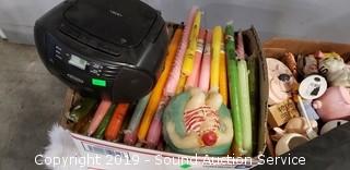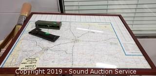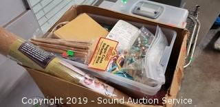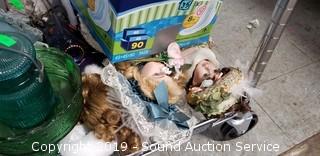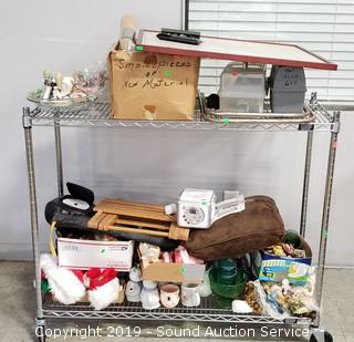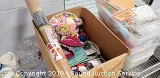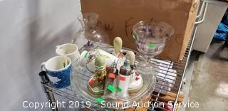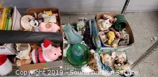 Includes: Pig Decor, Framed Map, Candlesticks, Pyrex Pie Pans, Christmas Decor, Porcelain Dolls, Crafting Supplies, Tools, Hardware, and more.