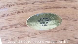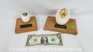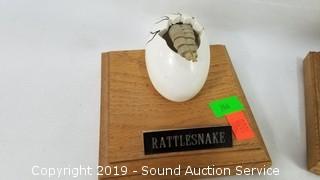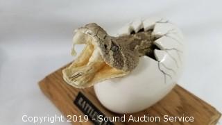 Includes: Rattlesnake tail emerging from a porcelain egg and rattlesnake head emerging from a porcelain egg. One of the fangs looks to be broken. Made of genuine rattlesnake. Approx. 3" and 4.5" H, 4" and 6" wide bases.