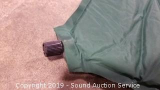 Sleeping bag is 33" x 75". Like new with bag. Has a small stain/dirty spot. Mat is approx. 21" x 70" and self inflating.
