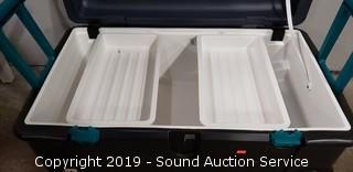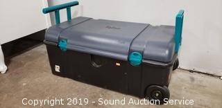 Has locking lid, wheels, tray insert. Approx. 13" H, 30" L, 17" W.