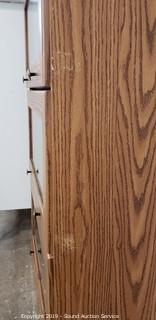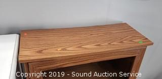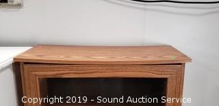 Wood grain finish, glass doors. The top is bowed. Approx. 46" H, 31" W, 12.5" D.