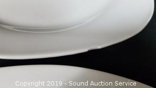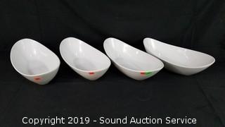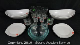 Includes: (4) 7.5" bowls (one has a chip), (4) 12" x 6.5" serving bowls, 5.5" and 7" Pyrex bowls, 5 highball glasses, and 4 tumbler glasses.