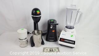Includes: Hamilton Beach Drink Mixer, Osterizer Blender, Hamilton Beach Electric Can Opener, and Hand Crank Coffee Mill.