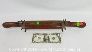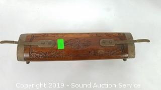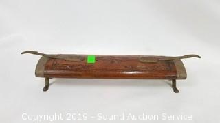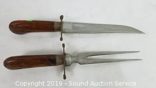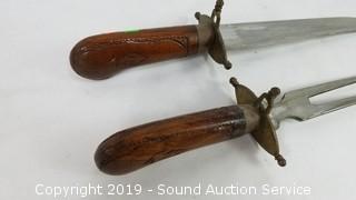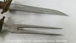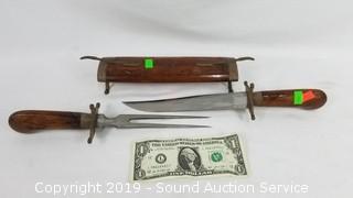 Hand carved wooden handle and sheath. Sheath doubles as a display stand. Brass adornments. Knife and fork lock in. Overall approx. 18" L.