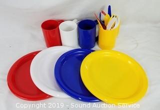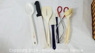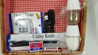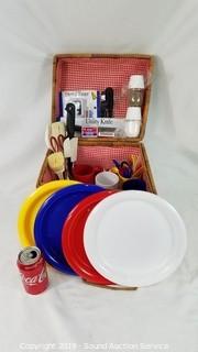 Comes with colorful cups, plates, utensils, S/P shaker, tongs, spatulas, can opener, and matches. Basket has some breaks in the wicker, approx. 11" H, 13" W, 11" D.