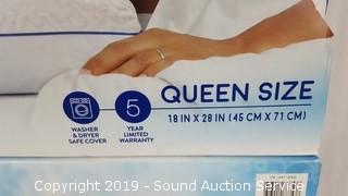 Queen size, 18" X 28". Removable covers. Both come in original boxes, one is like new, other has some loose threads on the edge.