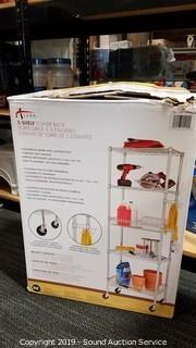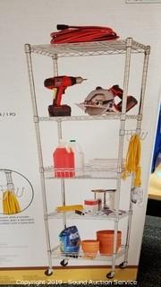Unassembled in original box. Contains 3 shelves and 2 basket shelves. Comes with 3" casters, 2 are locking. 1550lbs capacity without casters, 500lbs capacity with casters. Approx. 75" H x 24" W x 18" D.